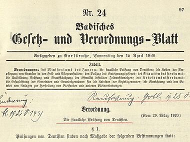 Badisches Gesetz- und Verordnungsblatt Nr. 24 vom 15. April 1920 mit der Verordnung „Die staatliche Prüfung von Dentisten“ vom 29. März 1920