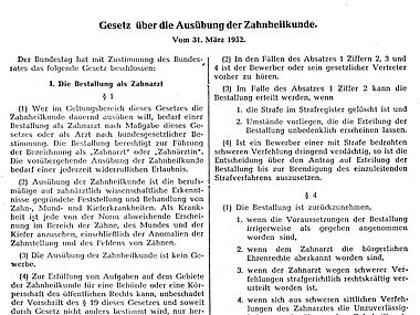 „In der Entwicklung des Berufsstandes der Zahnmediziner gab es beginnend in der Mitte des 19. Jahrhunderts über ein knappes Jahrhundert hinweg noch eine zweite große Gruppe von Zahnkünstlern, später Dentisten, die Zahnbehandlungen durchführten. Dieser sogenannte Dualismus wurde am 31. März 1952 mit dem „Gesetz über die Ausübung der Zahnheilkunde“ beendet. Seitdem ist es nur noch nach einem abgeschlossenen Hochschulstudium möglich, Zahnmedizin auszuüben.“